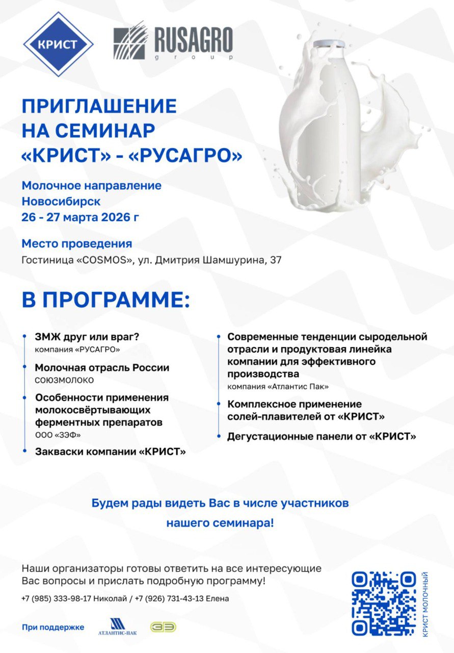 Приглашаем присоединиться! Наш партнёр — компания «КРИСТ» проводит отраслевой семинар «Молочное направление». Семинар состоится 26–27 марта 2026 года. До встречи на семинаре!
